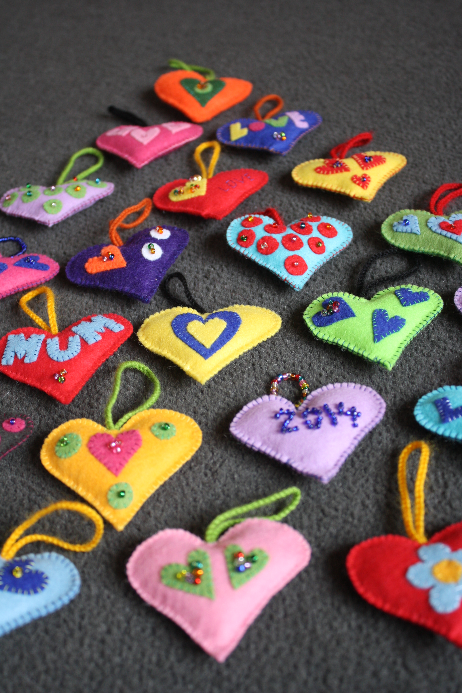 I used mainly felt to make the hearts and a blanket stitch to close them. I have then decorated the hearts with beads and made a nice loop out of wool to compliment the colours of the heart.
